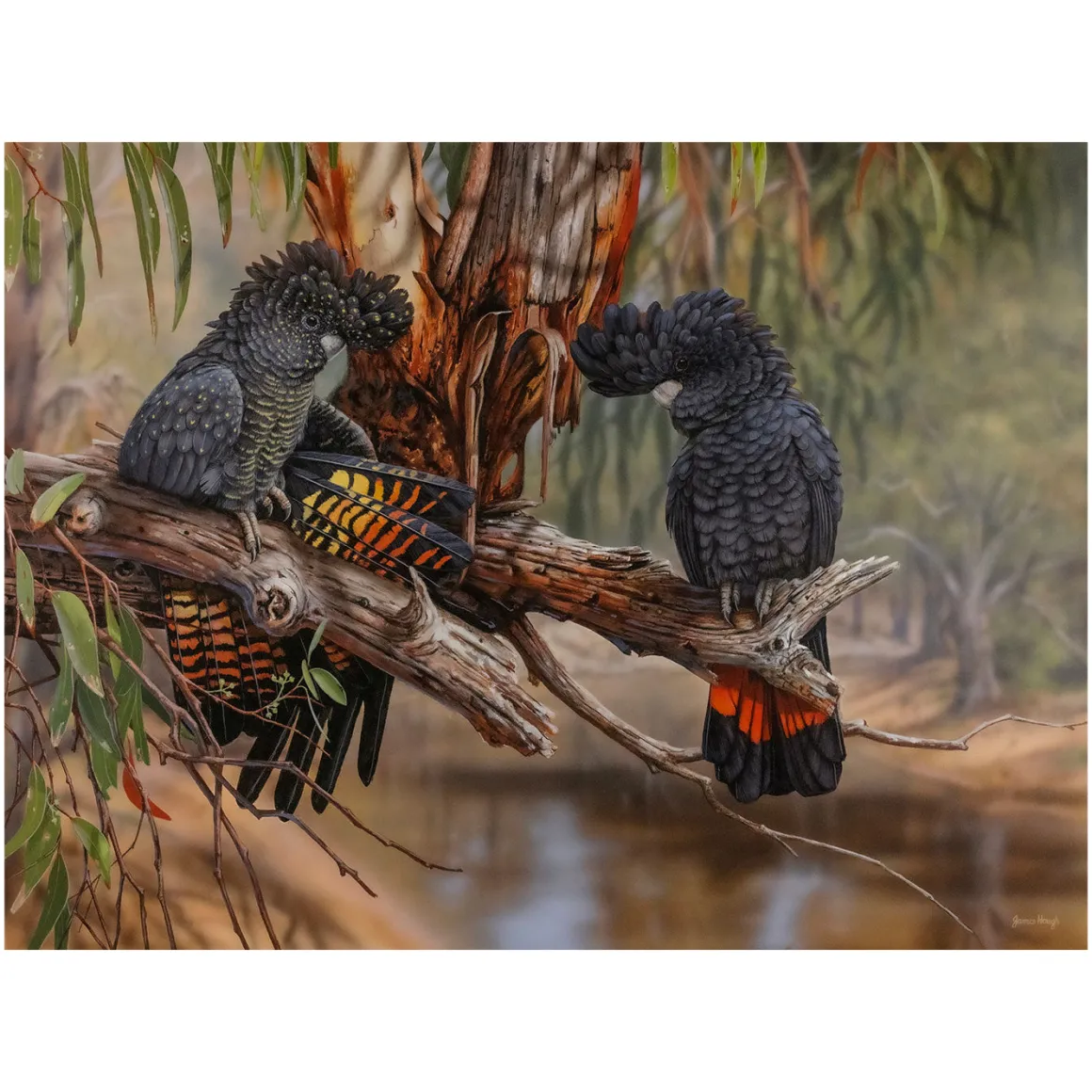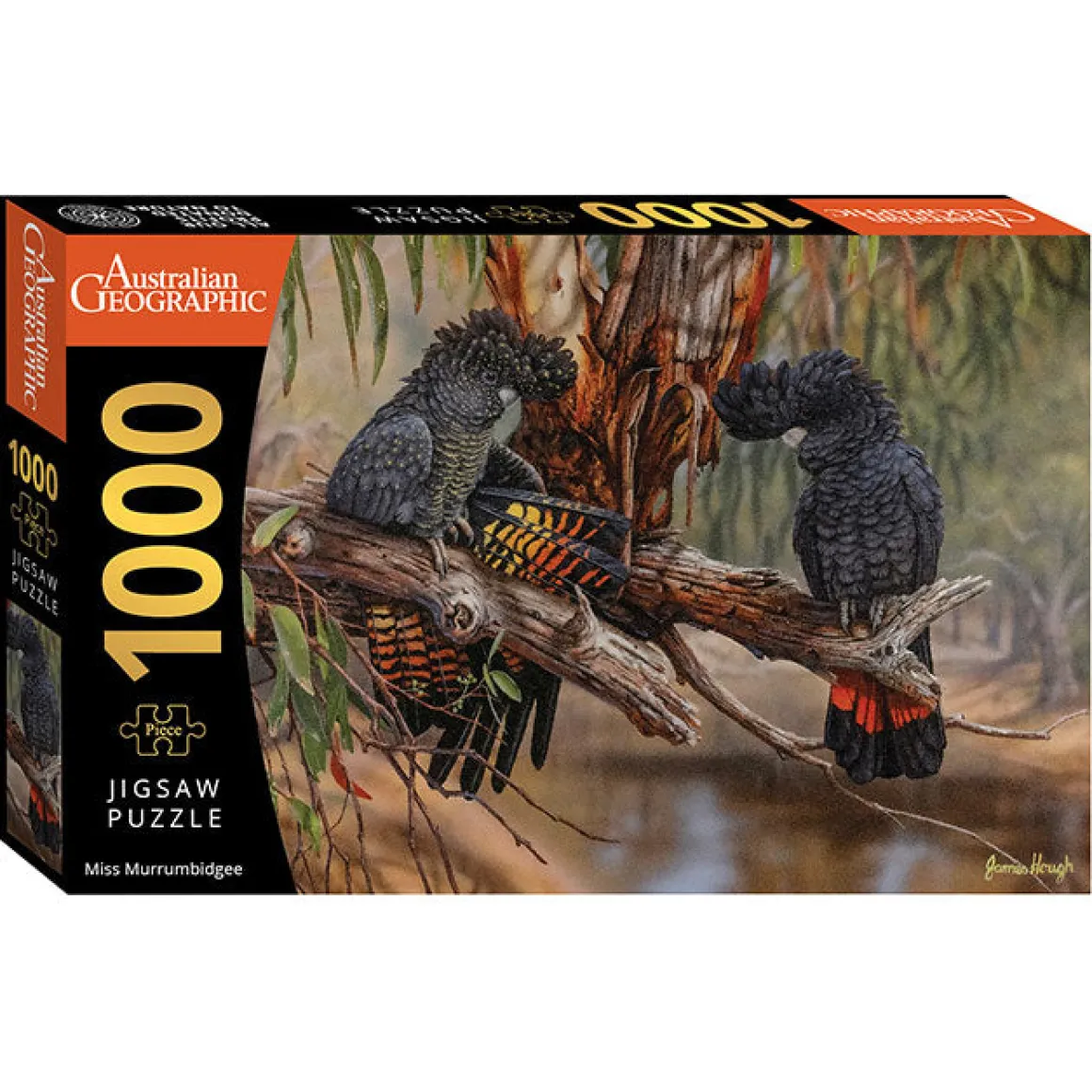 This puzzle features ‘Miss Murrumbidgee,’ a beautifully detailed image of a group of red-tailed black cockatoos, also showcased in the 2025 Australian Geographic Art Calendar.