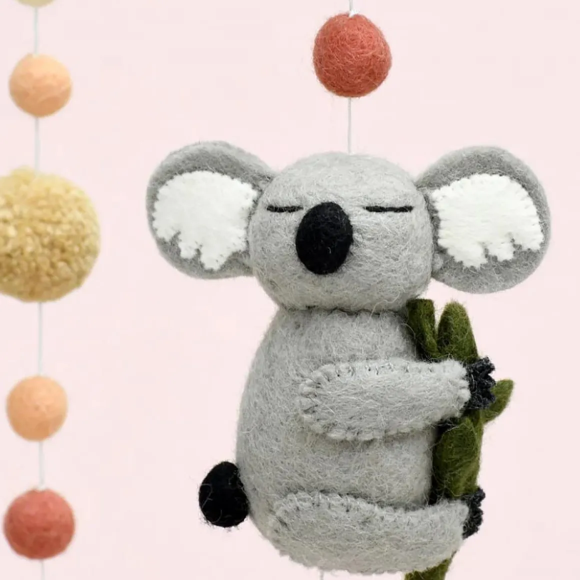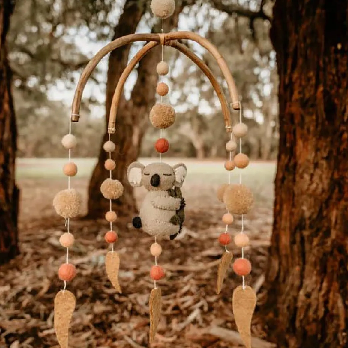 This cross-framed baby mobile features a sleepy koala hugging a tree branch surrounded by beautiful pompoms in earthy colours and eucalyptus leaves.