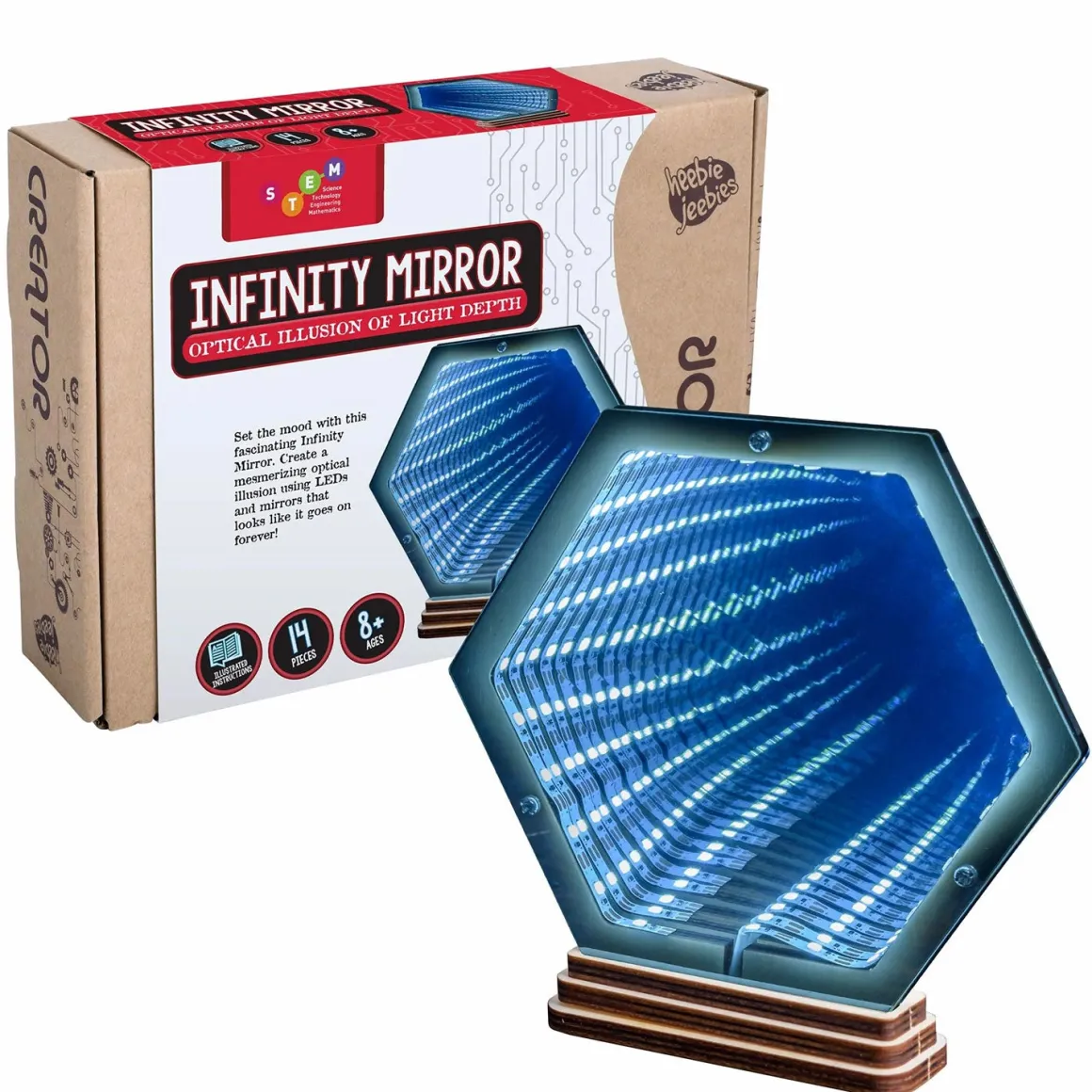 Build a mirror that seems to go on forever! The optical illusion of light depth in this Infinity Mirror is created with some simple pieces including LED lighting and a mirror backing. Don’t expect to see your own reflection staring back at you though – instead be drawn into an endless tunnel of light. A great weekend project for young and old, and a fun piece to display at home.