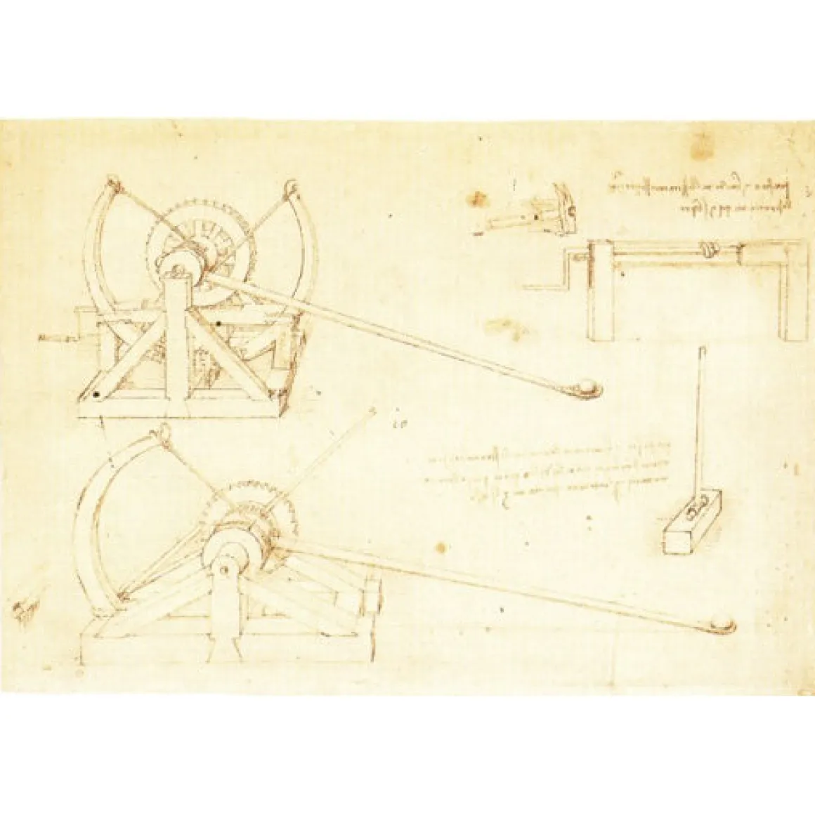 Catapults were first invented during the era of the Ancient Greeks and Romans, however it was during the Middle Ages that they came to prominence. Leonardo da Vinci developed a range of innovative war machines that improved upon traditional medieval designs. He designed this catapult in 1485.