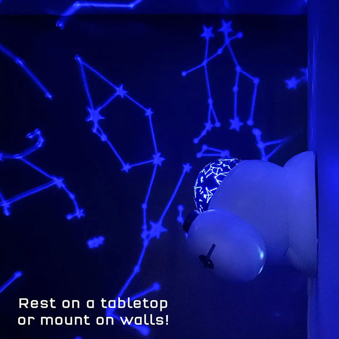 The Planetarium Projector from Thames and Kosmos turns your bedroom into your very own planetarium theatre! Illuminate a darkened room by casting projections of the stars in the night sky and space-themed images across the ceiling and walls. This home planetarium is actually two projectors in one. The first is a rotating star map dome that projects astronomically accurate maps of the stars; star maps for both the northern and southern hemispheres are included. The second projects space-related images, including all eight planets, eight human-made space objects like rockets and satellites, and eight extragalactic phenomena like nebula and galaxies. Use nightlight mode to automatically shut off the projector after 15, 30, or 60 minutes. The compact, space-saving design can be placed on a flat surface or hung on a wall. Includes colour educational poster and instruction sheet.
