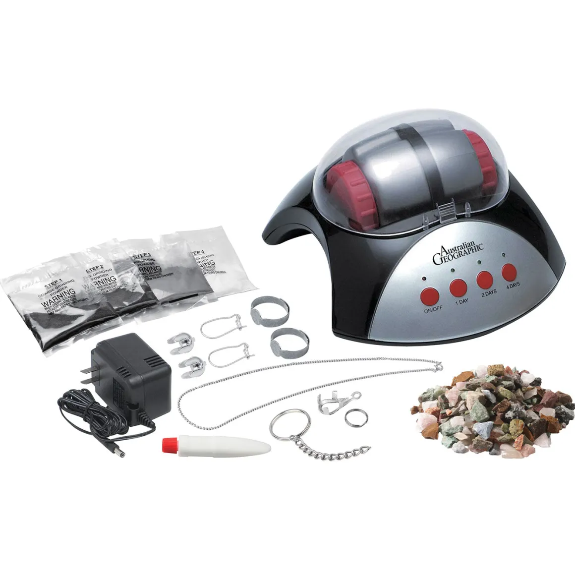 Set Includes: Rock tumbler, power cable, unpolished rocks, 4 polishing powders, 10 jewellery accessories (key chain with connector, setting holders, necklace chain, adjustable rings, earring hangers), glue and instruction manual.