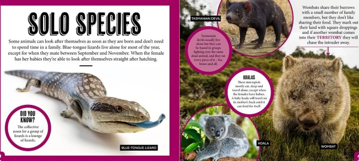 With stunning images from Australian Geographic’s extensive picture library, fun facts about native Australian wildlife and information on the variety of different family groups, this book is a great way to introduce the social structure of Australia’s unique animals. From huge flocks of galahs and giant schools of fish, to caring emperor penguin dads and koalas living alone, find out about the many different family relationships of Aussie animals.