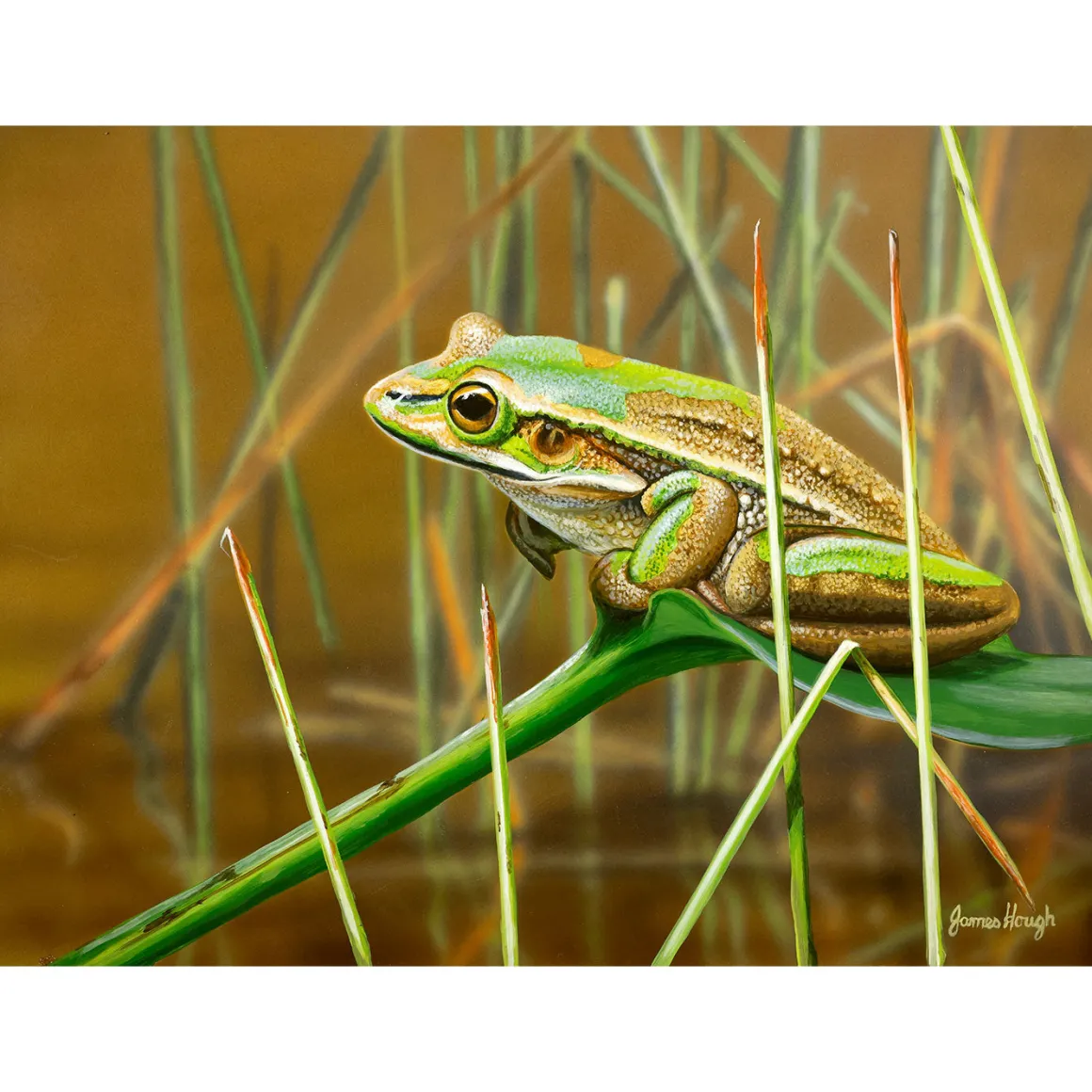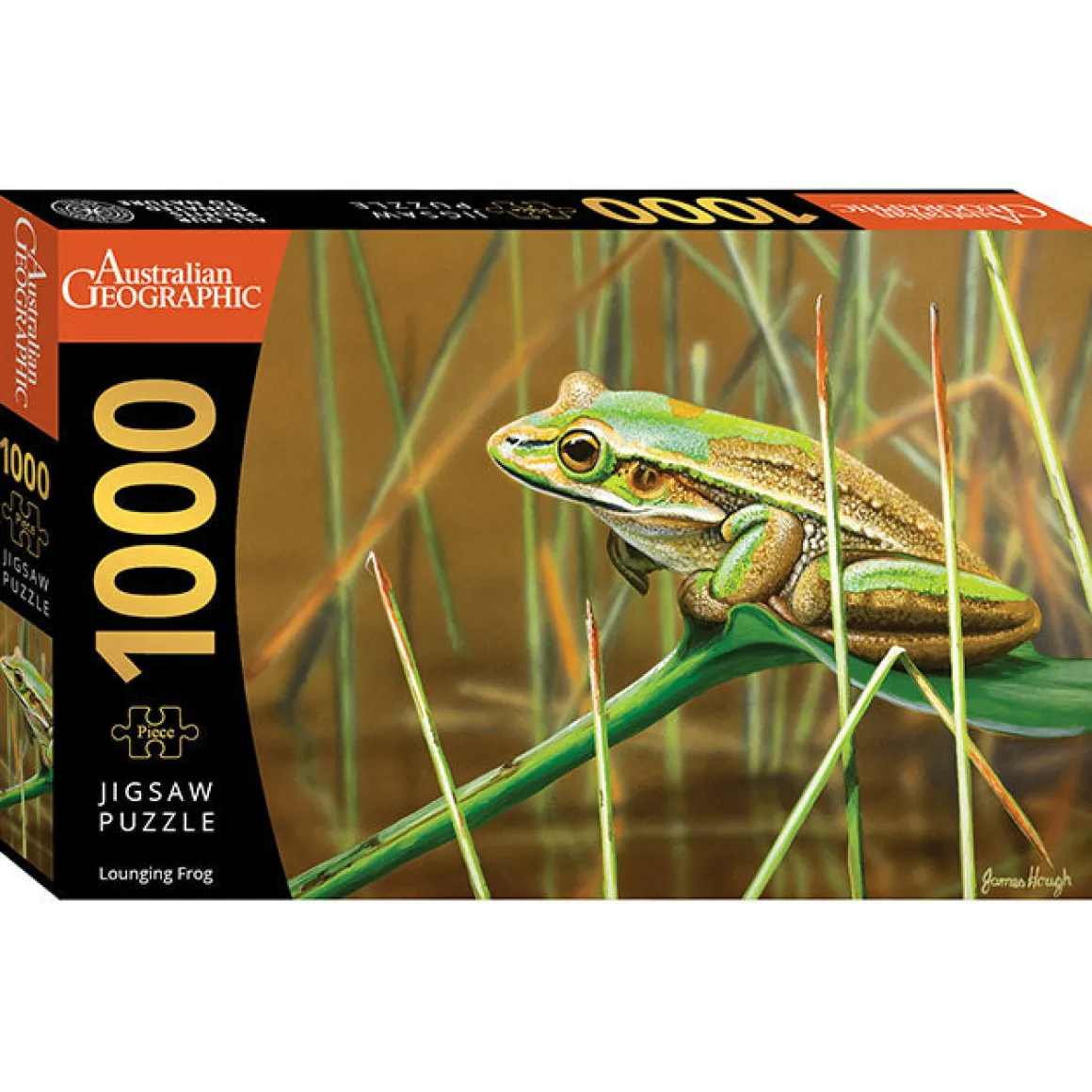 This puzzle features ‘Lounging Frog,’ a striking image of a green and golden bell frog, also showcased in the 2025 Australian Geographic Art Calendar.
