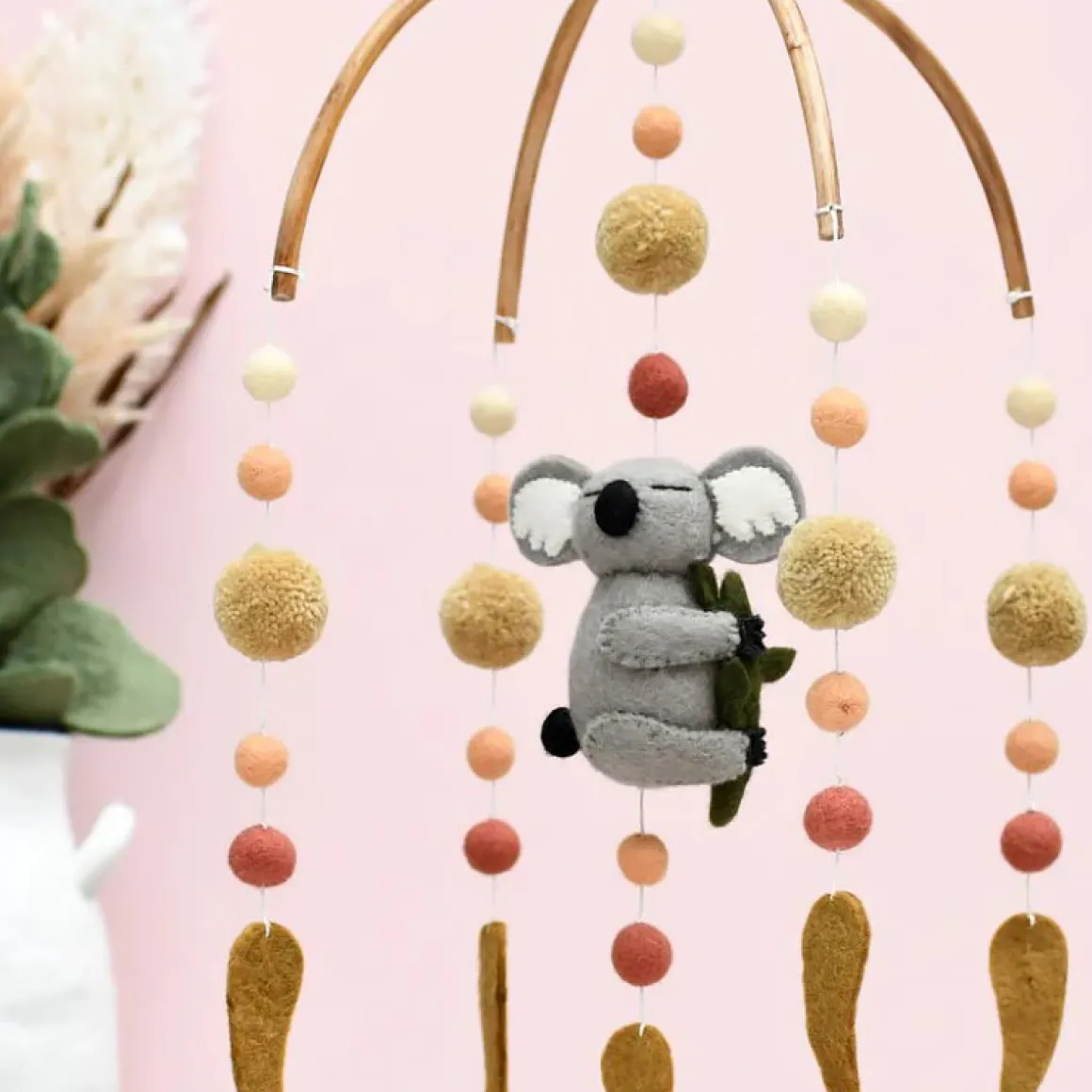 This cross-framed baby mobile features a sleepy koala hugging a tree branch surrounded by beautiful pompoms in earthy colours and eucalyptus leaves.