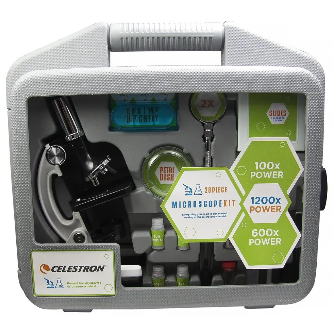 Conduct dozens of your own experiments with the 28 Piece Microscope Kit from Celestron. Includes a metal bodied microscope with 3 objective lenses (100x, 600x, and 1200x). Examine the 5 prepared slides or create your own using the 7 blank slides and cover slips. Also includes fun accessories like a 2x magnifying glass, plastic scalpel, and more.
