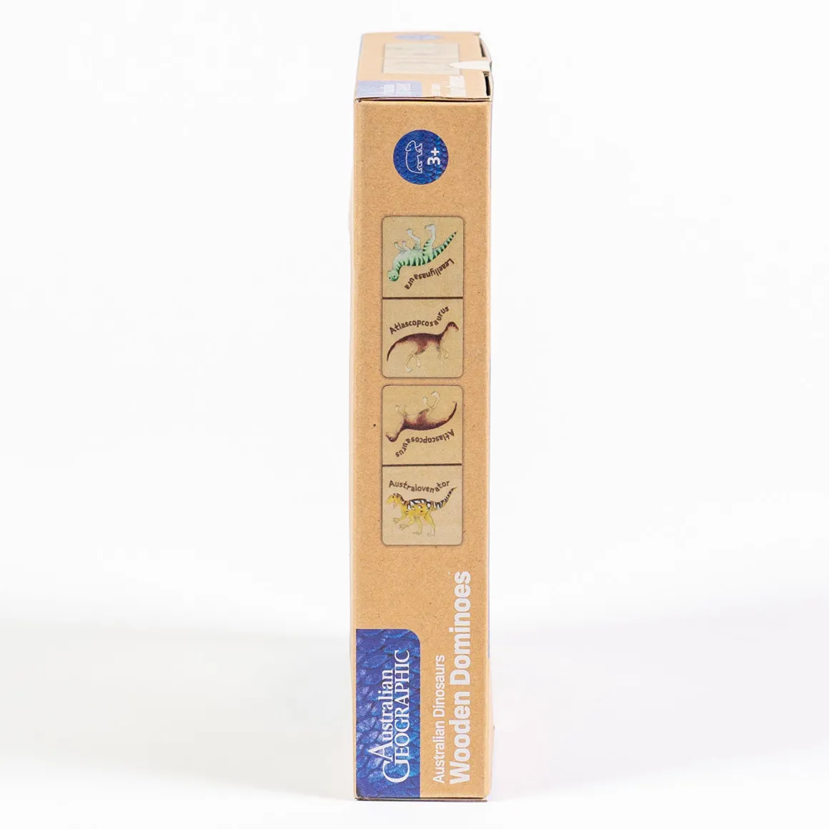 Did you know that the Brachiosaurus was as heavy as 18 cars? Learn about dinosaurs with this engaging Australian Geographic-produced dominoes game. Use the 32 wooden pieces to play the classic game of dominoes. The set also includes a range of educational, easy-to-understand information cards that offer facts and insights into eight well-known dinosaurs, from Ankylosaurs to Tyrannosaurus Rex.