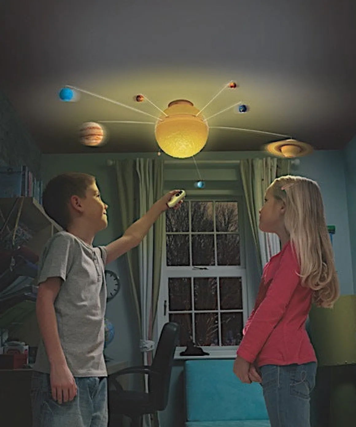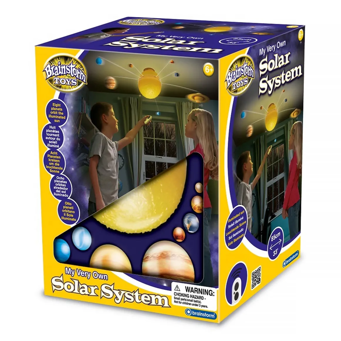 With My Very Own Solar System from Brainstorm Toys, you can explore the wonders of the universe from the comfort of your own room! This amazing remote controlled, motorised mobile has eight detailed, colour, planets that orbit the full sun. Simply assemble the planets onto the three independent orbit mechanisms on the sun and mount to the ceiling with the included fixings. Once mounted onto the ceiling the solar system is 85cm diameter at it’s widest point.