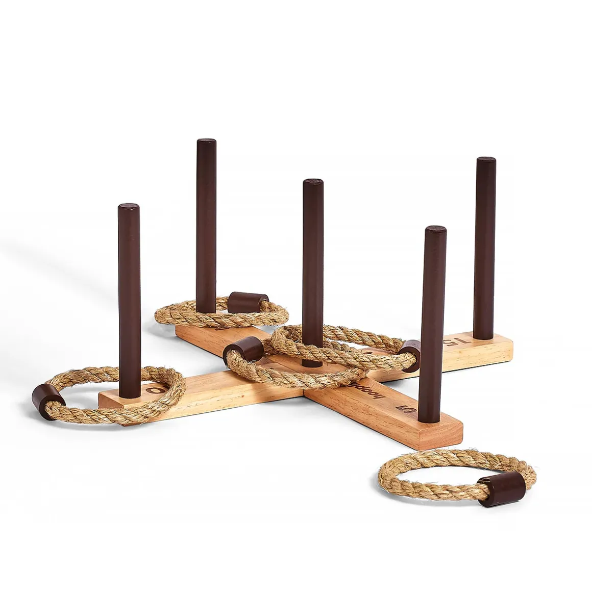 Hoopla is a simple but great fun traditional ring toss game for young and old. This version is played on a timber cross with 5 pegs and has origins as a Victorian parlour game. Hoopla will provide a lot of laughs at your next barbecue or children’s party. It is an excellent way to get the kids counting and adding in fives!