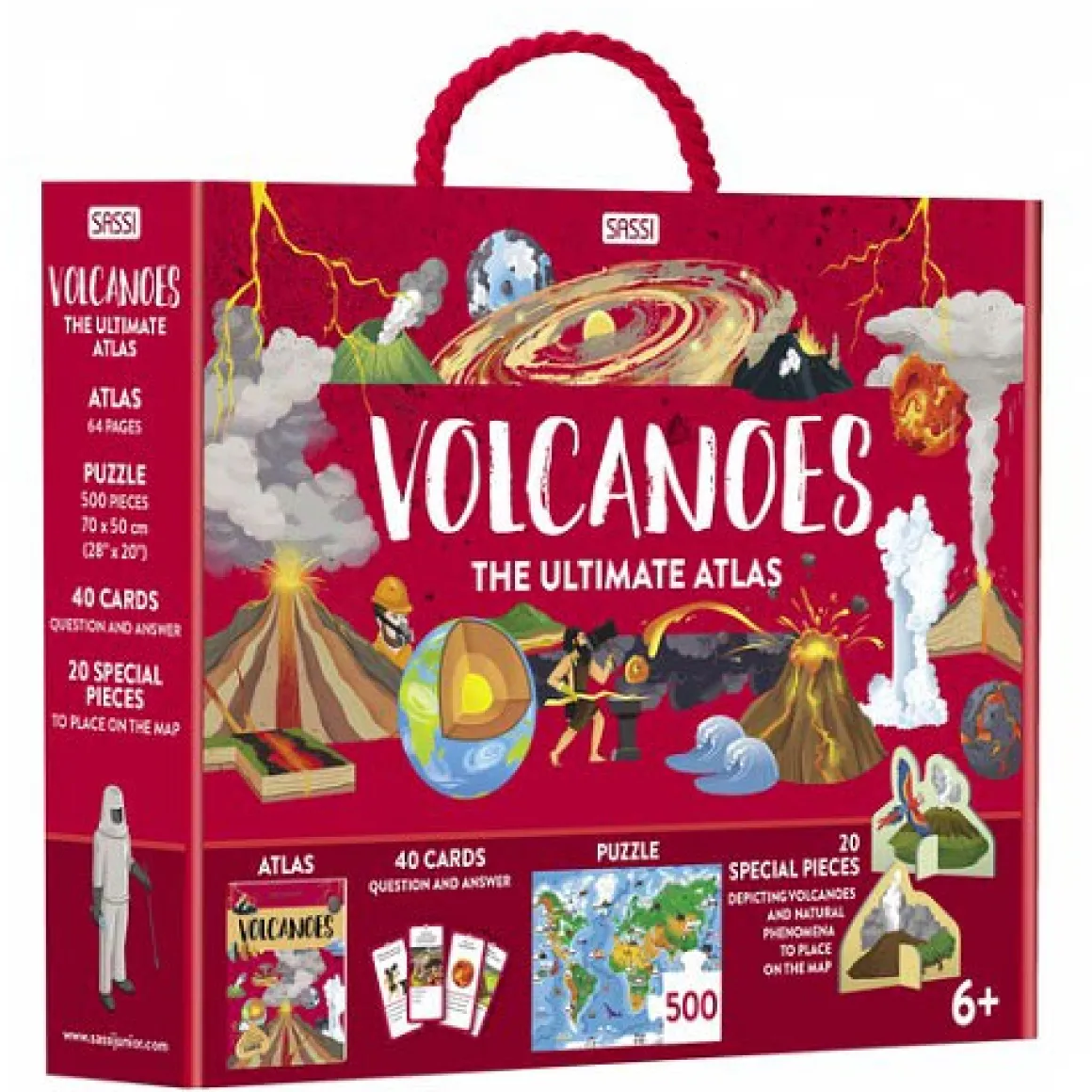 An atlas full of information and curiosities and a large box containing various fun and interactive activities dedicated to volcanoes to learn while having fun.